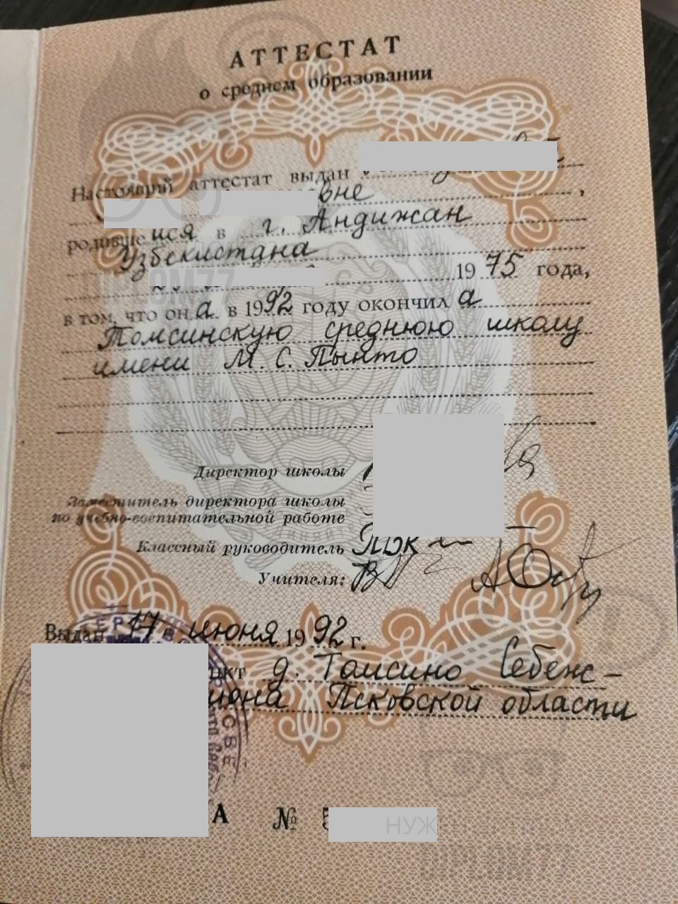 Ответ: Здравствуйте. Аттестат Узбекской ССР не сможем сделать. Только РСФСР есть бланки. Аттестат о средней (полном) общем образовании 1990 года выдачи будет стоить 25 000 рублей. Делается за 3-4 дня и плюс время доставки. Заказать документ можно (текущая страница). Подробнее о вариантах оплаты и доставки здесь: https://diplom77v.cfd/dostavka