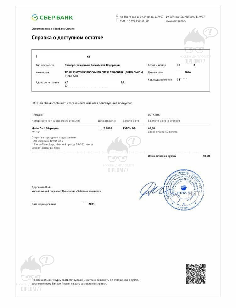 Диплом77 много лет делает такие справки, имеет огромную базу от всех банков России и не только. И лучшим вариантом купить справку о состоянии счёта (доступном балансе) является заказать её на нашем сайте. Напишите нам на Ватсапп или Телеграм. И можете выслать ваш образец (если есть). Мы предварительно вышлем вам макет на согласование. Если что-то не понравится, то переделаем под ваши требования. Также можем доставить готовый документ в любую точку мира.
