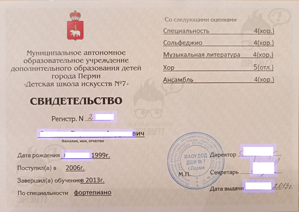 На Диплом77 всегда можно заказать свидетельство об окончании музыкальной школы недорого. Нас выбирают постоянные клиенты. Многие из них оставляют благодарные отзывы на нашем сайте. Мы более 20 лет изготавливаем документы музыкальных школ со всей Российской Федерации. Если вы закажете у нас документ — тоже не забудьте потом вернуться и оставить отзыв! Мы будем очень благодарны!